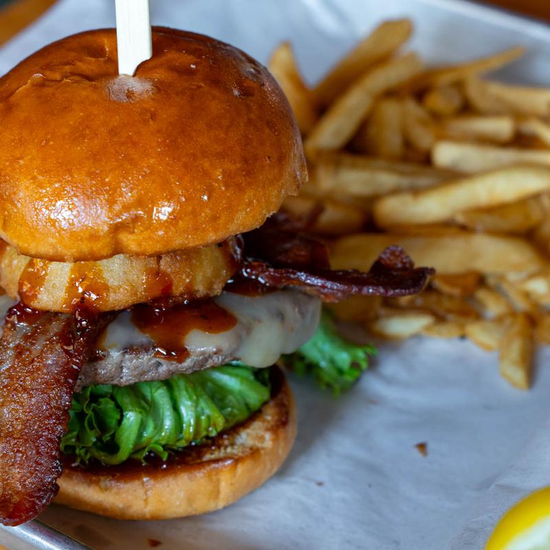 1/3 Angus Chuck Patty, bacon, Pepper Jack, lettuce, tomatoes, and onion rings. Spicy BBQ sauce on a Brioche bun.